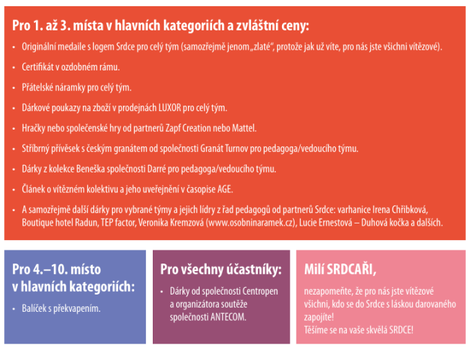 Kdo naše SRDCE zažil, ví, že v něm nejde o výkon. Sami SRDCAŘI říkají, že největším vítězstvím pro ně je všechno, co společně od začátku až do konce se Srdcem s láskou darovaným prožili. A největší odměnou radost a uznání těch, kterým vykouzlili úsměv na tváři; fakt, že si vyzkoušeli, co v týmu společně dokážou. I tak pro vás my organizátoři spolu s partnery projektu vždycky chystáme krásné dárky pro radost. A to nejen pro finalisty, kteří mají to štěstí být na slavnostním setkání ve sněmovně, ale alespoň maličký dárek také pro všechny, kdo se zapojí, ať už jsou z kteréhokoli konce naší republiky nebo třeba i ze zahraničí. Na co se tedy můžete těšit ve 12. ročníku?